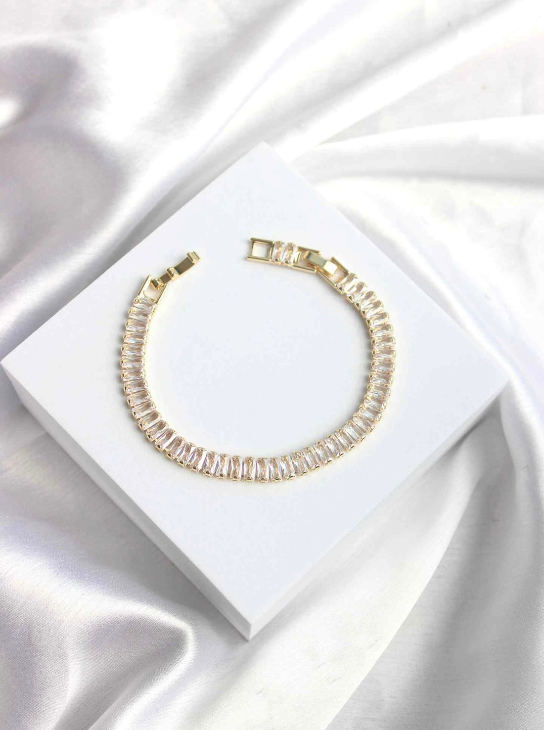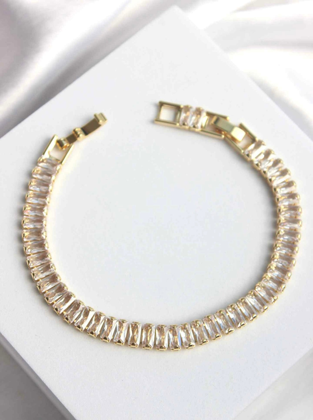 Amour Tennis Bracelet, Crafted from high-quality brass and luxuriously plated in 18k gold, this piece exudes a radiant warmth that effortlessly elevates any look. Its delicate design is adorned with a seamless line of shimmering stones, capturing the light—and hearts—with every movement.
